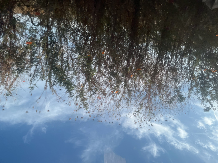 The scene depicts an outdoor natural environment, identified as being in Mangu Halle, Nigeria. The upper third of the frame is a bright blue sky with scattered, wispy white cirrus clouds. The lower two-thirds are occupied by a dense thicket of tall, slender vegetation, primarily appearing as stalks and branches with a mix of green and brown foliage. Approximately a dozen small, spherical, orange-colored flowers are interspersed among the plants. No human subjects, animals, or man-made objects are discernible within the image. The ambient light indicates a daytime setting.