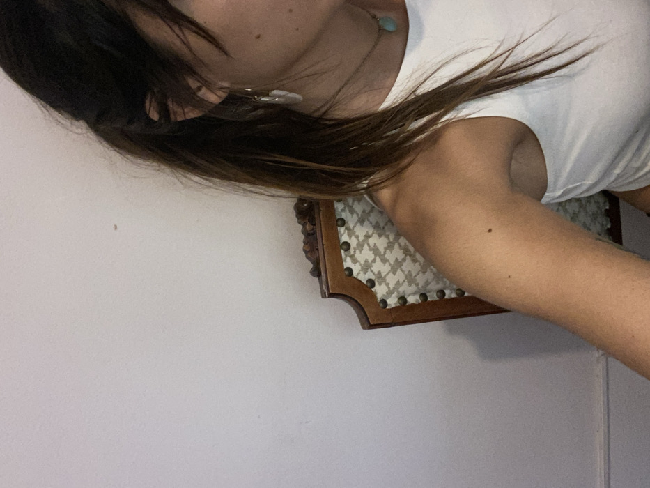 The image displays a partial view of an individual, likely female, seated indoors. The upper right quadrant of the frame shows the right side of the person's head, neck, shoulder, and upper arm. The individual has long, dark brown hair, some strands draped over the right shoulder. A light-colored, irregularly shaped dangle earring is visible on the right ear, and a thin chain necklace with a small, round, light blue or turquoise pendant adorns the neck. The person is wearing a white, high-necked sleeveless top. The skin tone appears tanned. Behind the individual, a portion of a dark-stained wooden chair with decorative carving along its top edge and an upholstered back is visible. The upholstery features a light-colored, possibly houndstooth or patterned fabric, studded with metallic tacks along the frame. The background to the left is a plain, light-colored wall, possibly off-white or light gray, with a small, faint reddish-brown speck slightly above the center-left. A subtle horizontal line, possibly a baseboard or dado rail, is visible near the bottom of the wall on the left. No specific architectural or environmental features are present to determine a precise location within Barcelona, Spain.