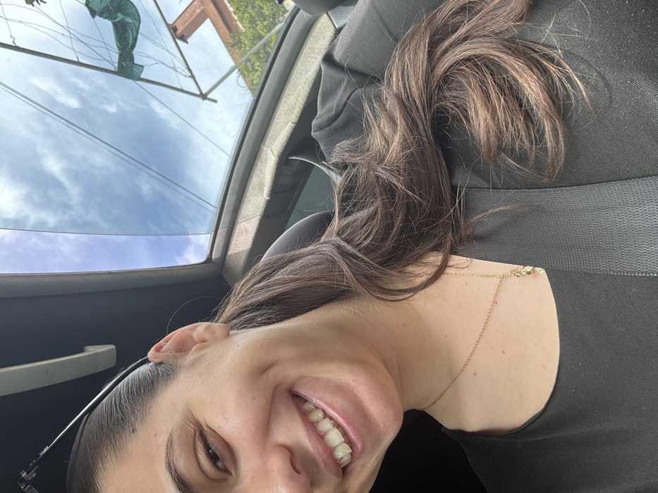 A female individual is partially depicted in a selfie-style photograph, seated in the front passenger seat of a vehicle in Ormideia, Cyprus