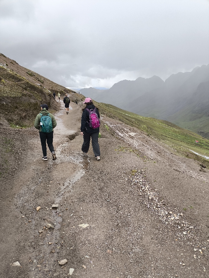A group of hikers treks a muddy, rocky path. The weather is overcast, and mountains loom in the background, partially obscured by mist. The path is a mix of dirt and exposed rock, showing signs of recent rain. Two women, with backpacks, lead the way, followed by others further down the path. Vegetation grows on the slopes beside the path.