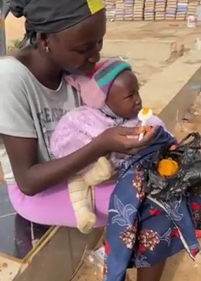 A medium shot shows a woman sitting and feeding a baby who is sitting on her lap. The woman wears a gray t-shirt, purple leggings, and a black headscarf with a yellow stripe. The baby wears a lilac snowsuit, striped socks, and a striped beanie. The woman holds a white plastic spoon and is feeding the baby a bite of bright orange food. A black plastic bag sits on the woman's lap and holds more of the orange food. Behind them are stacks of bags filled with materials for construction. The woman looks into the baby's face while feeding it, then looks off to the side.