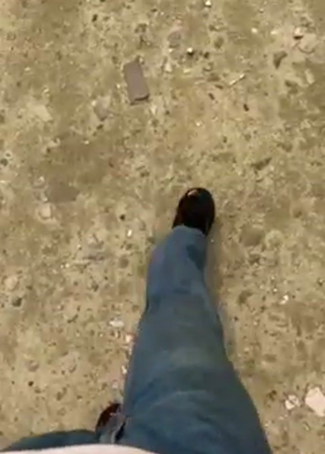 A first-person perspective video shows a person walking on a mottled, light-colored, possibly concrete or paved surface