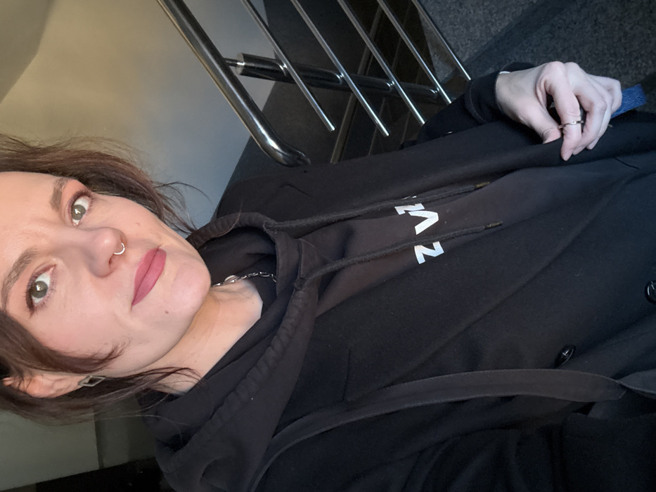 A female individual is depicted in a close-up, waist-up portrait, positioned indoors, identified as being in the city of Boreti, Montenegro. She has shoulder-length dark brown hair, fair skin, and greenish-hazel eyes. Her facial features include a small, silver-colored hoop septum piercing and a geometric-shaped silver-colored earring on her left ear. She is wearing pink lipstick and eye makeup. Her attire consists of a black hooded sweatshirt with white lettering, "z v", partially visible on the chest, and a silver-colored chain necklace with large oval links. Over the sweatshirt, she wears a black long-sleeved overcoat or blazer with lapels and two visible dark buttons. A dark strap, likely from a bag, is visible over her left shoulder. Her right hand is partially visible, resting near her torso, and displays a ring on the ring finger. The individual looks directly into the camera with a neutral expression. The background reveals an indoor setting, specifically a staircase, with dark steps and a modern, shiny metallic railing composed of multiple horizontal bars. The walls are plain, in varying shades of grey, and illuminated by light entering from the left side of the frame.