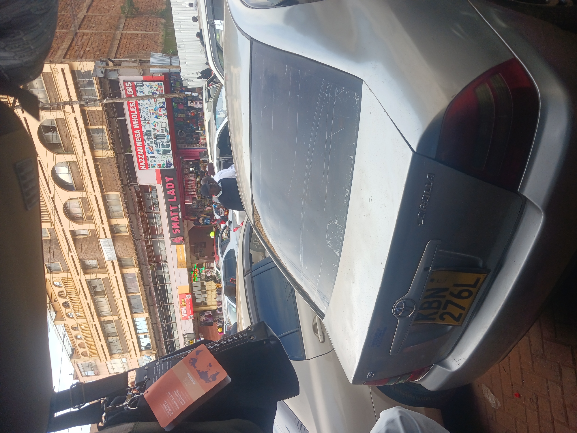 The image depicts a congested urban commercial street in Kenya, observed from a low perspective, likely from inside a vehicle. In the immediate foreground, a dark object with an orange "KUAIBAO" tag hangs on the left. A silver Toyota Corolla sedan, bearing license plate KBN 276L, occupies the lower center, its rear window dusty and marked with scratches. Red and clear plastic debris are present on the reddish-brown brick pavement to the left. The midground shows multiple vehicles in traffic and pedestrians navigating the street. Visible individuals include a man in a black cap and sweater and another in a white shirt. Commercial storefronts line the street, featuring signs for "HAZZAN MEGA WHOLESALERS," "SMATT LADY," and "VEM Liquor." A utility pole and a corrugated metal construction barrier are visible on the right. The background is dominated by a multi-story tan building with arched windows, balconies, and balustrades, characteristic of an older urban structure. The sky is overcast.