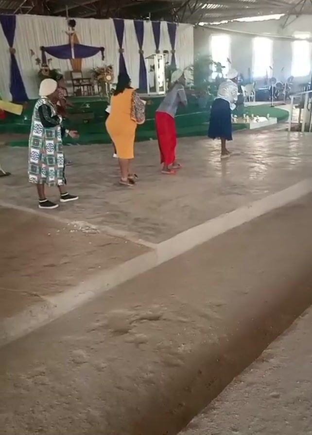 five women standing in what appears to be a church or community hall. The hall has a high, exposed metal roof, and light is streaming in through windows. The floor is concrete, with a distinct rectangular area slightly raised and marked off with a painted line. In the background, there is a decorated stage area with a backdrop of white and blue fabric. The women appear to be rehearsing or practicing something. They are dressed in a variety of outfits, including dresses, skirts, and tops. One woman walks forward into the frame. They seem to be interacting and communicating, possibly receiving instructions from one of the women. In the very background, musical instruments can be seen.