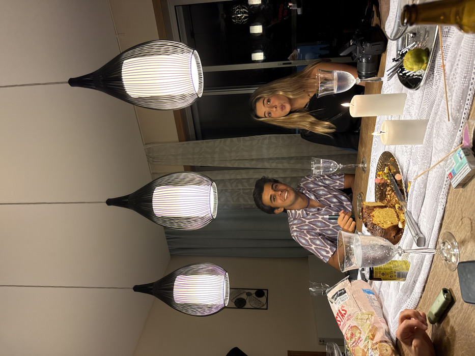 An indoor residential dining scene, located in Vila Nova de Gaia, Portugal, depicts two young adults seated at a wooden table covered by a white lace-patterned tablecloth