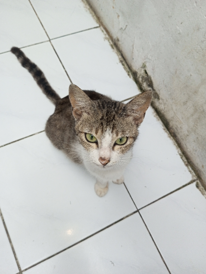 - "An overhead shot depicts a tabby cat with green eyes and a white bib sitting on a white tiled floor" by FM-4YnJo2, licensed under CC BY 4.0