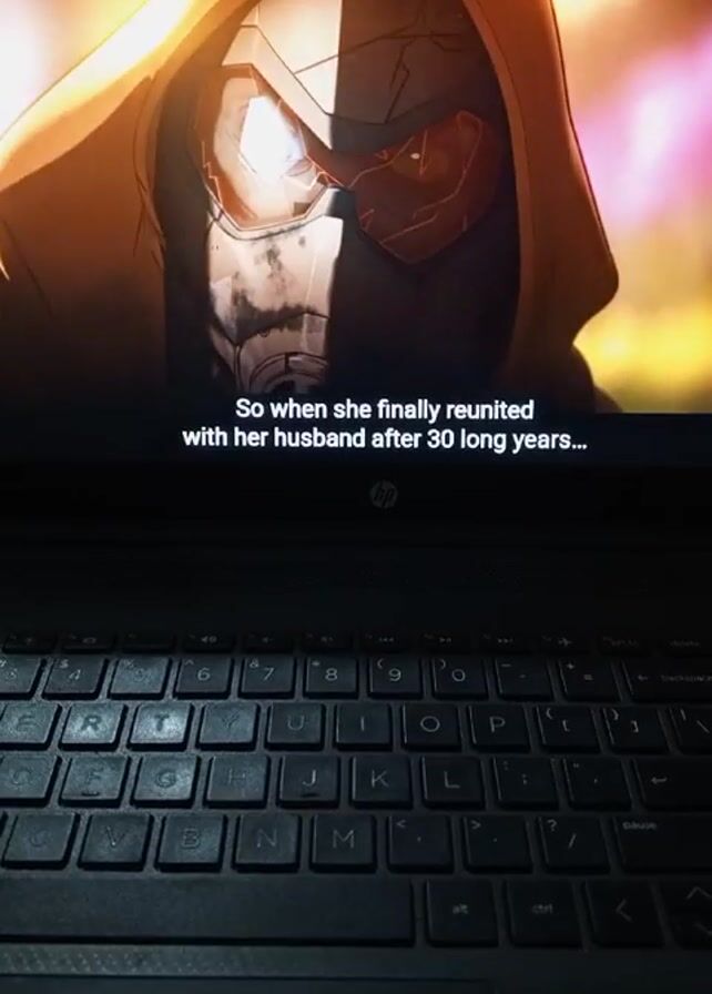A person is watching a video on an HP laptop. The video shows an animated clip of a masked figure with a skull face, snarling. Prior to this clip, it shows an older man wearing a helmet. The subtitles read "So when she finally reunited with her husband after 30 long years... (SNARLING)". The laptop keyboard is visible, with wear and tear on some of the keys. The environment appears to be indoors, with limited lighting.