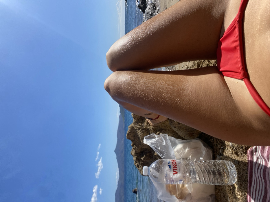 The scene depicts a first-person view of an individual reclining on a beach in Skala, Greece. The immediate foreground features the tanned legs and lower torso of the person, positioned with knees slightly bent and feet obscured. A red bikini bottom covers the groin area, with the skin exhibiting minor texture, possibly from sand or goosebumps. A small portion of a red and white striped towel is visible beneath the left leg. To the left of the legs, a transparent plastic bottle of "VIKOS" brand water stands on the sand, next to two clear plastic bags containing indeterminate items. These objects are situated against a formation of light-colored natural rocks. The midground consists of the calm, blue sea, with small waves breaking near dark rocks along the shoreline on the right. A solitary swimmer's head is partially visible in the far left of the water. The background reveals a distant, undulating landmass, likely mountainous, under a clear blue sky dotted with a few wispy white clouds. The entire scene is brightly illuminated by direct sunlight.