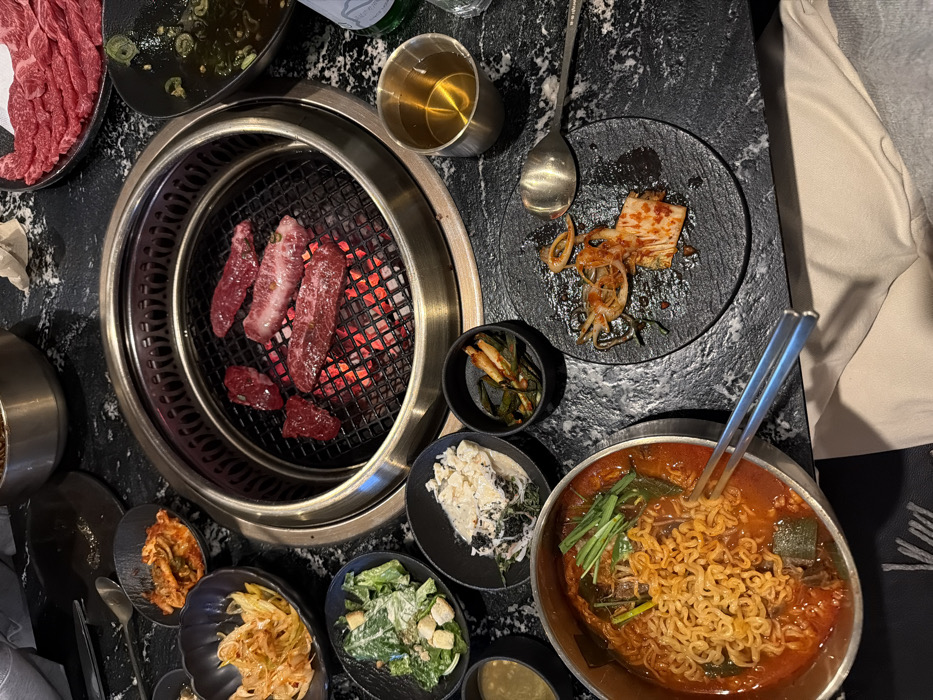 A table arrangement featuring Korean BBQ. Raw beef sits on a plate, awaiting grilling over the charcoal grill at the table's center. Various small dishes surround it, holding kimchi, a salad, and seasoned vegetables. A bowl of ramen, chopsticks placed within, is also present, alongside a metal cup filled with a light-colored liquid, likely soju. A silver spoon rests on the table.