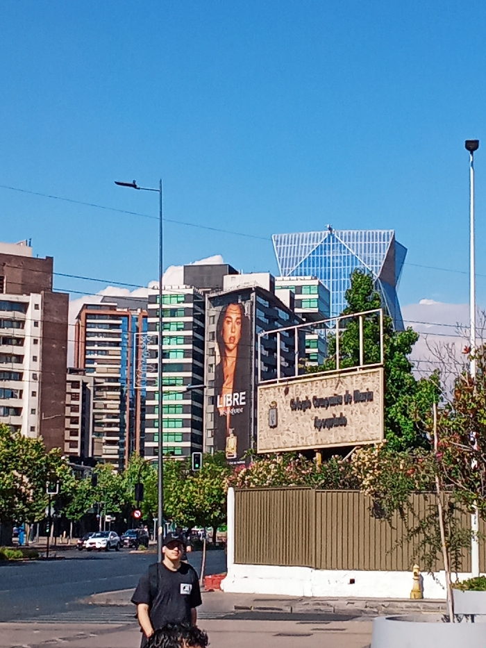 A street scene with a man wearing a hat and black shirt in the foreground. Behind him, a street lined with buildings of varying heights and architectural styles, including a modern, glass-faceted skyscraper. A billboard shows a woman. A sign reads "Colegio Conjunto Maria Ayppendida". Green trees are scattered throughout the scene under a clear, blue sky.