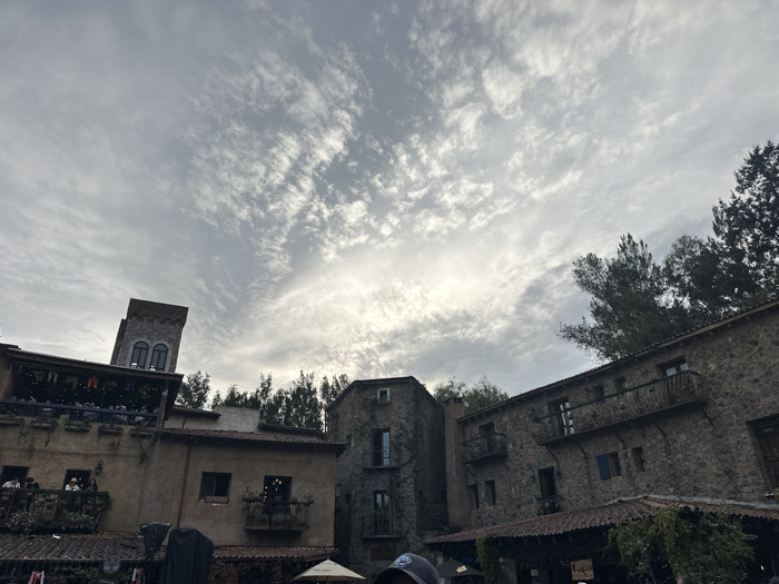 A low-angle shot showcases weathered stone buildings under a cloudy, overcast sky