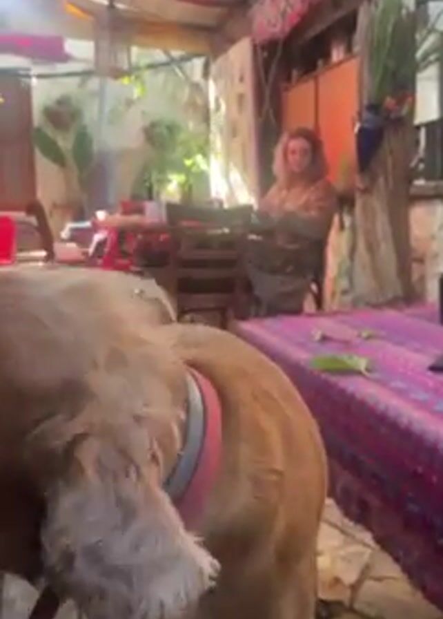 reddish-brown Cocker Spaniel dog standing near a table with a purple patterned tablecloth. The dog has a light blue collar. A woman with long red hair sits in a wooden chair at a table behind the dog, looking at a tablet. There are other tables and chairs visible in the background, suggesting a cafe or restaurant setting. The area is covered by a canopy of patterned fabric.