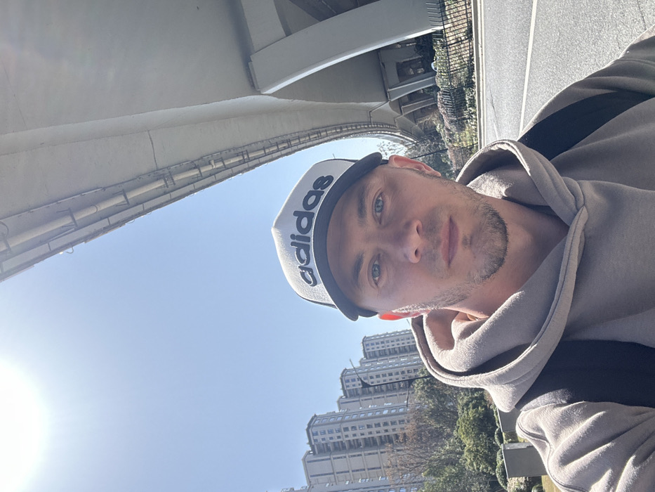 A man in an Adidas cap and grey hoodie takes a selfie outdoors
