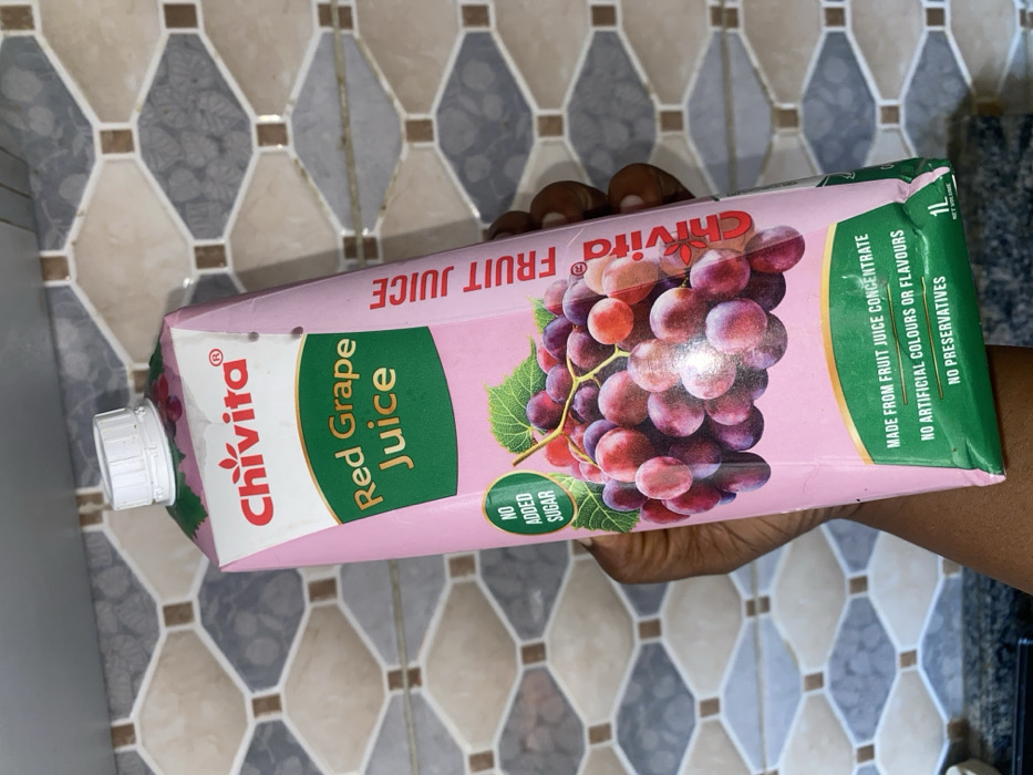 - "A right hand with dark skin tone holds a pink 1-liter carton of Chivita Red Grape Juice in an upright position" by FM-ttvvF2, licensed under CC BY 4.0