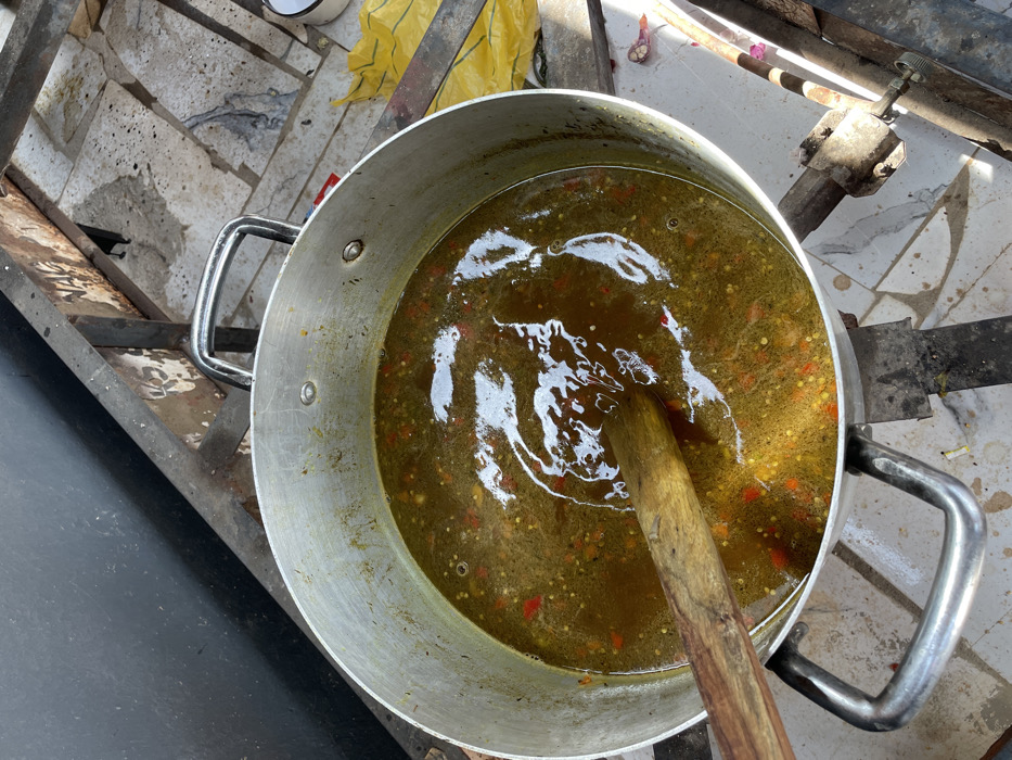 The scene depicts an outdoor or semi-outdoor cooking area in Bar Gada, Nigeria. A large, used silver-colored metal pot with two integrated metal handles is centrally positioned, resting on a dark, utilitarian metal frame, which serves as a cooking stand, likely for a gas burner. The pot contains a substantial quantity of olive-green liquid food, resembling a stew or soup, characterized by numerous visible red flecks (consistent with chili peppers) and smaller yellow-green particulate matter. A wooden stirring stick is partially submerged within the liquid, angled from the lower left towards the center. To the immediate right of the pot, a gas line, equipped with a brass-colored valve, extends towards the unseen burner beneath the pot. The ground surface consists of light-colored, mottled or speckled tiles. In the background, behind the cooking stand, a dark, uniformly painted wall is visible. Ancillary objects on the tiled ground include a crumpled yellow plastic bag, a small white enamel cup, and scattered reddish-purple organic matter, consistent with onion or garlic peels.