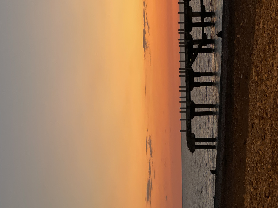 The image displays a coastal scene in Batumi, Georgia, during a sunset or sunrise, evidenced by the gradient sky. The sky transitions from a vibrant orange and red at the horizon, through lighter orange, to a pale desaturated grey-blue at the zenith. Scattered, horizontally elongated cloud formations are visible in the mid-sky. The dark blue-grey sea appears slightly agitated, with discernible wave patterns extending to the horizon. A concrete pier, characterized by its weathered appearance and multiple vertical support pillars, extends into the sea from the right side of the frame. The pier's horizontal platform features evenly spaced vertical posts along its length, suggesting remnants of a railing. Structural cross-bracing is visible between pillars on the right portion of the pier. The foreground consists of a dark, pebbly beach, with stones varying in size and exhibiting shades of brown, orange, and grey. Two silhouetted human figures are present on the wet sand near the water's edge. One individual is situated on the left, adjacent to the pier's entry point, while the second individual is positioned on the right, beneath the pier structure. Both figures appear to be seated or stooping. The overall environment is a serene, low-light coastal setting.