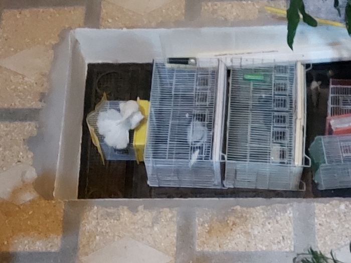 The image depicts a vertical arrangement of birdcages situated within a recessed architectural niche in a textured wall in M'diq, Morocco. The wall surrounding the niche is constructed from light-colored, speckled beige and brown tiles. The niche itself is framed by a smoother, light-colored trim, and its interior back wall appears dark. At the uppermost position, a small, decorative birdhouse-shaped item with a yellow base and a light blue roof contains a white, fluffy, static bird effigy with fanned tail feathers. Directly below this, two rectangular, light-grey wire birdcages are stacked. The upper cage encloses a single light-colored bird perched inside. The lower stacked cage contains at least one dark-colored bird and features a green tubular feeder attached to its right side. At the bottom of the niche, several smaller, empty wire cages are partially visible, including one in green and others displaying orange accents. Portions of green foliage are visible in the lower left foreground, and a thin yellow stalk appears in the lower right foreground, outside the niche.