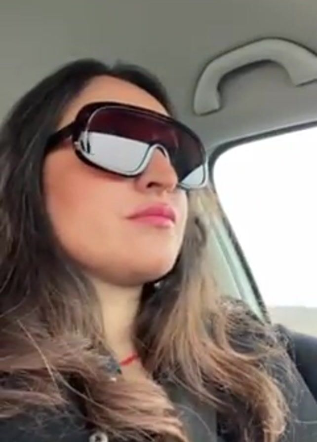 woman driving a car. She is wearing sunglasses, a black jacket, and a red necklace. She has long brown hair. The car's interior is visible, including the steering wheel, dashboard, and a safety handle. The background shows a blurry landscape of buildings and vegetation. The woman sticks out her tongue and purses her lips. Audio is present with someone speaking in German.