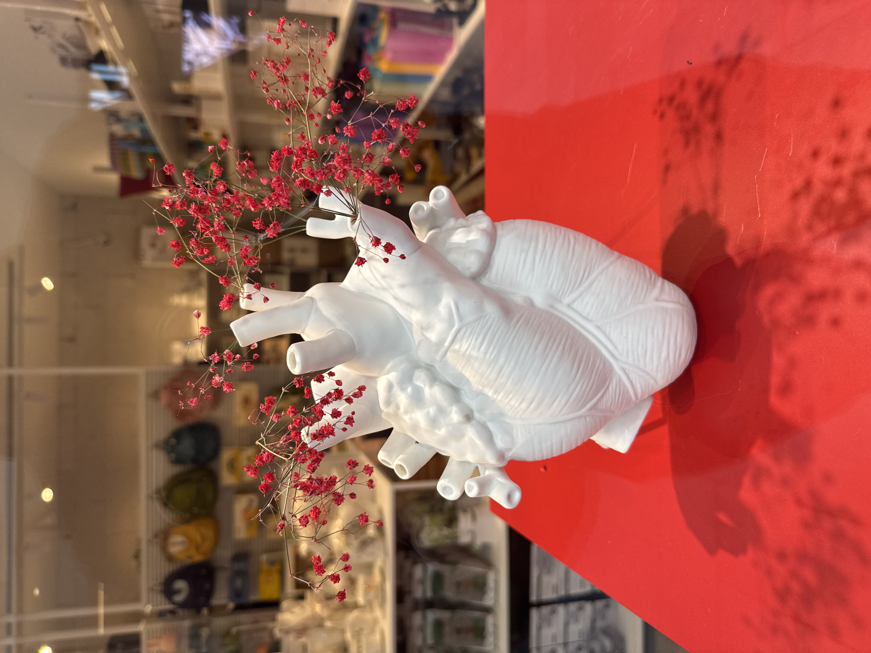 A white, anatomical human heart-shaped vase, featuring detailed ventricles and major vessel openings, stands centrally on a glossy, vibrant red surface. Delicate branches of small, dried red Gypsophila flowers are arranged within the upper openings of the vase. Shadows from the vase are cast onto the red surface. The scene is viewed through a glass panel, displaying reflections of overhead lighting. The blurred background depicts the interior of a retail store, with shelves visible holding various merchandise, including colorful bags and other items. This scene is located in the city of Herzliya, Israel.