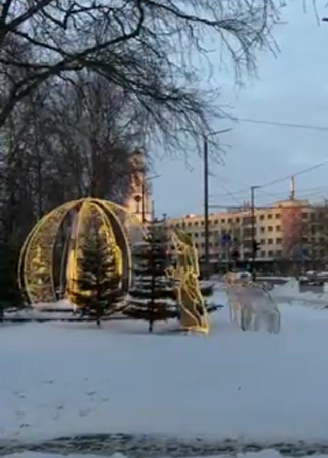 The camera shows a snowy park with Christmas decorations in the daytime. The decorations include a large, spherical, lighted structure; a couple of small, real evergreen trees; a lighted figure of an angel; and a lighted figure of a few deer. Bare trees and building exteriors are visible in the background. There are no people in sight.