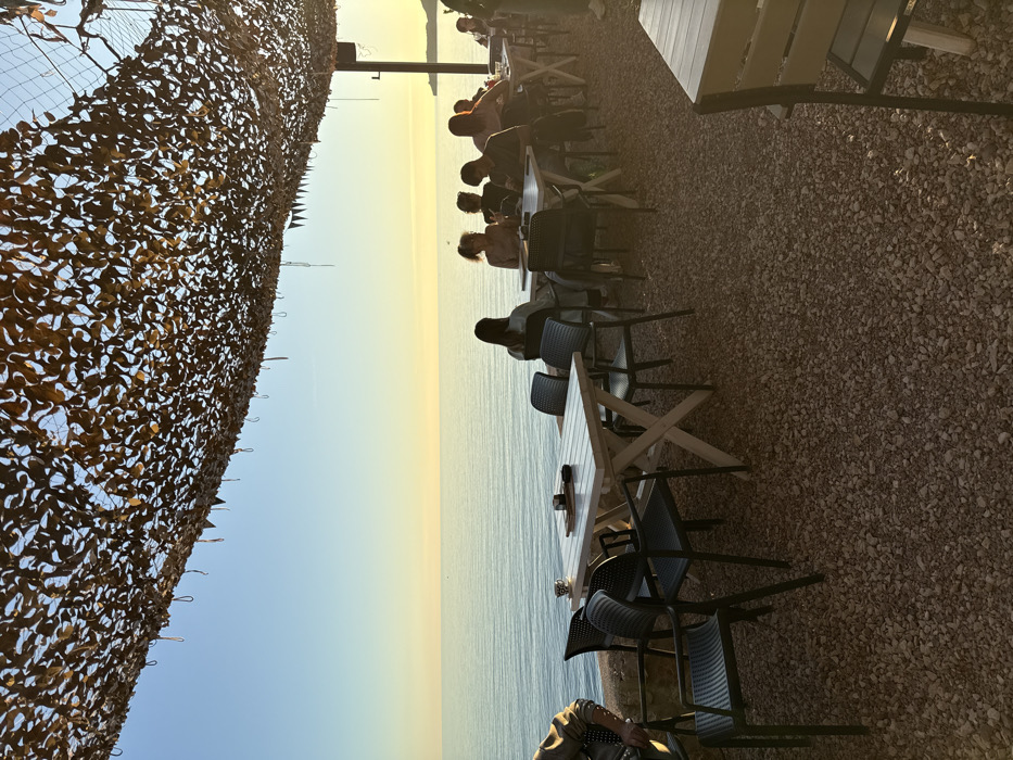 The image portrays an outdoor dining area at a coastal establishment in Kamenovo, Montenegro, during late afternoon or sunset. The scene overlooks the calm Adriatic Sea, which reflects the clear sky transitioning from blue to a golden-orange hue at the horizon. An overhead canopy constructed from camouflage netting, adorned with small triangular pennants, covers the seating area. The ground consists of light-colored gravel, bordered by a low stone wall at the water's edge. Multiple light-colored wooden tables with slatted tops and dark-colored chairs are arranged on the gravel. In the mid-ground, a group of approximately five to seven individuals is seated at two conjoined tables, engaged in conversation. Their specific actions beyond seated interaction are not discernible. On a table in the left mid-ground, a single cup, an ashtray, and two small dark rectangular objects are present. A person wearing a light-colored garment is partially visible in the far-left foreground. Additional patrons are visible at tables further to the right. A dark vertical structural support for the canopy is positioned on the right side of the frame.