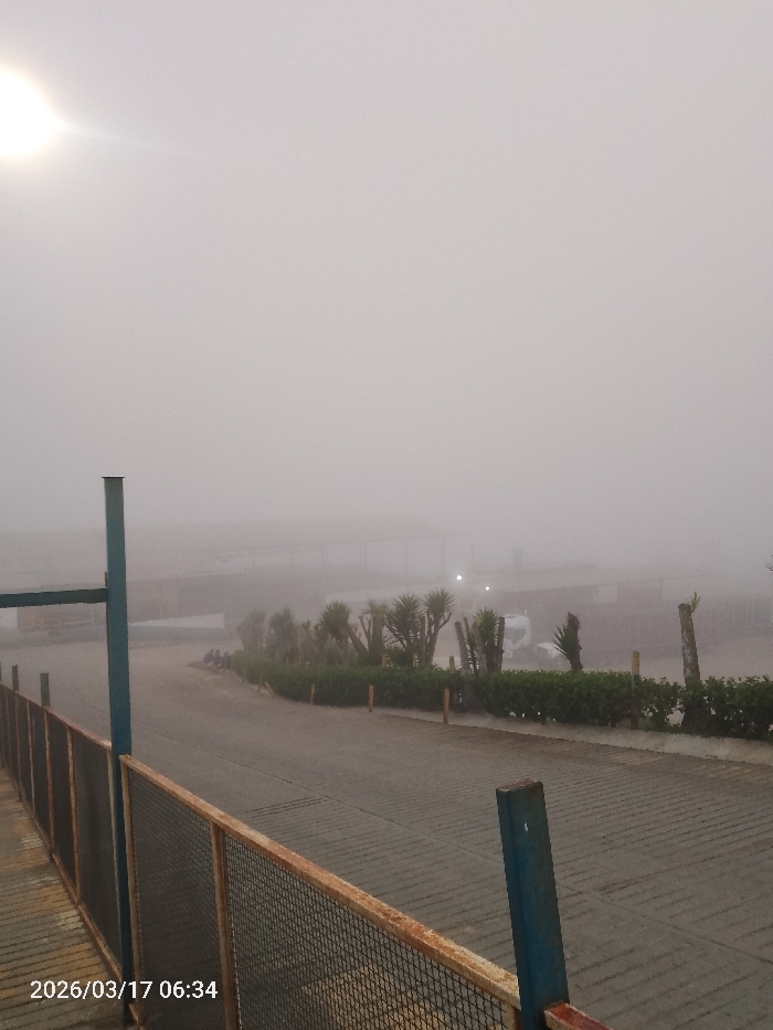 The image depicts an outdoor scene in Cumbre Roja, Venezuela, captured on 2026/03/17 at 06:34, characterized by dense fog. The upper half of the frame is dominated by a uniform gray fog layer, through which the sun appears as a bright, diffuse glare in the upper left quadrant. No people are visible. In the foreground, a rusty, rectangular metal mesh fence with a solid horizontal bar runs along the bottom and extends partially up the left side. It is supported by blue-green painted metal posts, one prominent on the far left and another to the right, partially visible. A gray, corrugated surface, possibly a walkway or platform, is present behind the fence. The midground features a paved roadway or driveway curving gently to the right, constructed of what appears to be dark gray interlocking pavers or patterned concrete. This road is flanked by a low, dense green hedge, behind which are several tall, palm-like plants or yucca trees, some appearing trimmed or cut. Wooden posts are spaced along the hedge. In the background, multiple large, light-colored buildings, possibly industrial or commercial structures, are heavily obscured by the thick fog, their details largely indistinguishable. Two distinct points of artificial light, likely from within or near the structures, are visible through the fog. A white vehicle, potentially a truck or van, is faintly discernible behind the vegetation on the right side of the road. The overall environment is one of low visibility due to atmospheric conditions during early morning.
