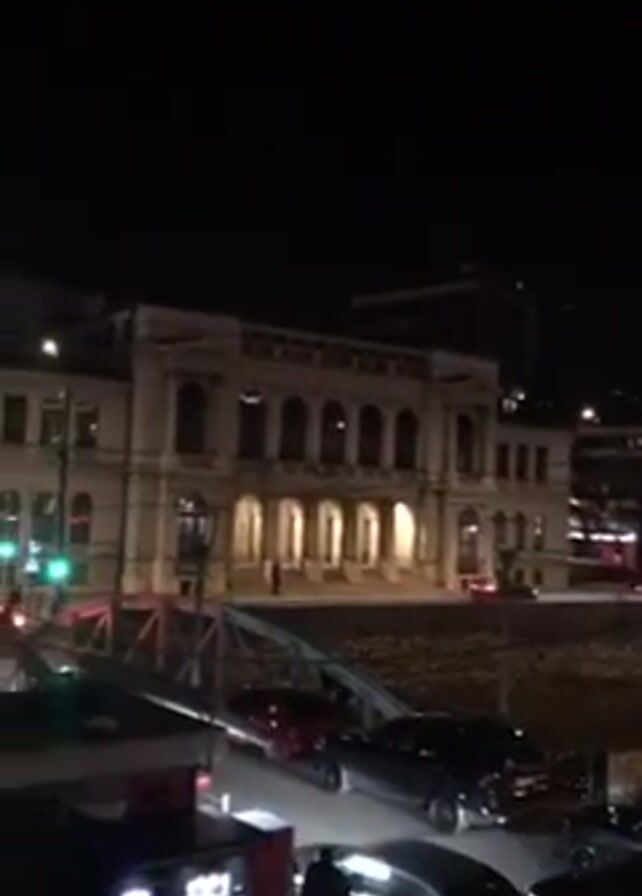 city at night, with cars moving on the street, seen from an elevated position. There are tall buildings with many windows, lit up against the dark sky. Traffic lights are visible, changing from red to green. A smaller structure, possibly a vending machine, is in the foreground. The scene is dimly lit, highlighting the buildings and vehicle lights. There are also construction materials partially covering the elevated position of the person recording.
