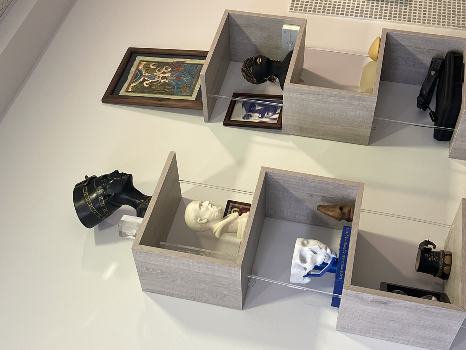 The image depicts an interior scene in Yerevan, Armenia, showcasing two interconnected Z-shaped wall-mounted shelving units against a light-colored wall. The shelves are constructed from a light-toned wood-grain material and feature clear acrylic vertical supports. On the left shelving unit, from top to bottom: The uppermost shelf holds a black bust of Nefertiti facing right, alongside a clear, rectangular prism object. The middle shelf displays a white bust of a bearded man, also facing right, with a small framed religious icon partially visible behind it. The third shelf from the top features a white and blue anatomical model of a human jaw resting on a blue object or book, which bears the Latin phrase "EXPERIENTIA EST OPTIMA MAGISTRA." To its right is a small, brown, carved wooden object resembling a human nose. The lowest visible shelf contains a dark-colored decorative mug with an elephant-head handle and metallic accents. On the right shelving unit, from top to bottom: A large framed artwork depicting a multi-figure religious scene in an antique style hangs on the wall above the upper portion of this unit. The shelf adjacent to the left unit's middle shelf holds a vertical framed black and white photograph of a man's face, positioned next to a black bust of a woman's head, adorned with gold headwear and large gold hoop earrings, and a small rectangular light-colored object behind it. The next shelf down contains two light-colored, irregularly shaped objects resting flat. The lowest visible shelf displays a black zippered case or bag with a black strap. To the far right, a grey, textured wall panel or grille is partially visible.