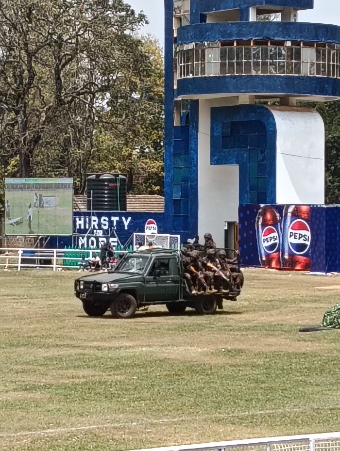 The image depicts a scene at the Nairobi Gymkhana Club in Nairobi, Kenya. A dark green pickup truck, consistent with a Toyota Land Cruiser 70 series, is traversing a mowed grassy field from left to right. Approximately 10 to 15 individuals, dressed in dark military-style uniforms or fatigues and helmets, are seated in the open bed of the truck. One individual is visible in the driver's seat. In the left background, a large video screen displays a cricket match in progress, showing a batsman and a fielder. Below the screen, a white perimeter fence is present, along with a banner partially obscured but featuring the text "HIRSTY FOR MORE" and a Pepsi logo. A black water tank rests on a building roof behind this banner. In the right background, a prominent multi-story pavilion building, predominantly blue and white, features a rounded, multi-windowed upper section that resembles a control tower. Adjacent to this building and behind the truck, a large blue banner displays multiple large images of Pepsi cans. Dense green foliage and trees are visible in the distant background. The sky is bright.