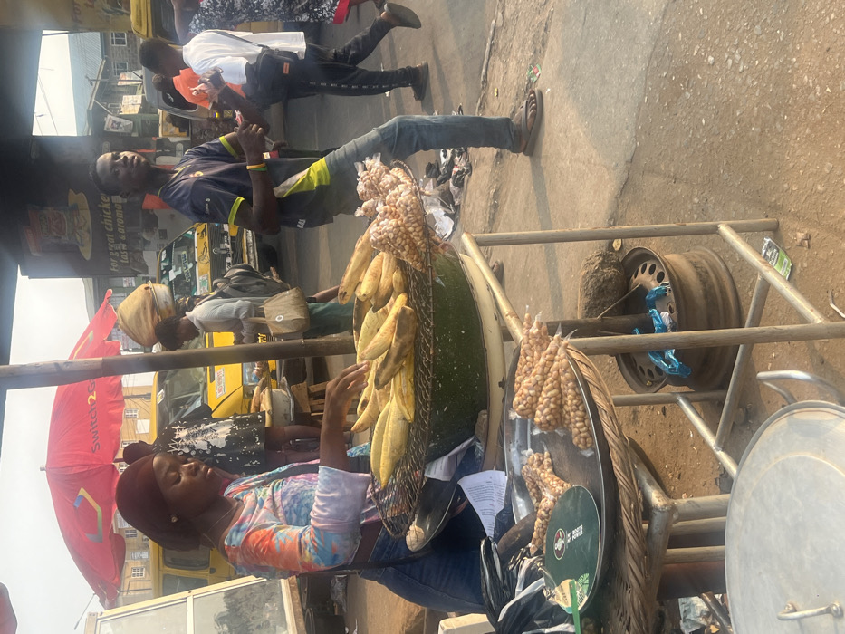 A woman in a colorful shirt and maroon headscarf sits behind a food cart. The cart displays plantains and small bags of peanuts. A red umbrella provides shade. People walk by in the background, including a man in a yellow and navy blue shirt and a person carrying something on their head. A yellow vehicle and various buildings are also visible in the background. The cart itself is built on top of a wheel.