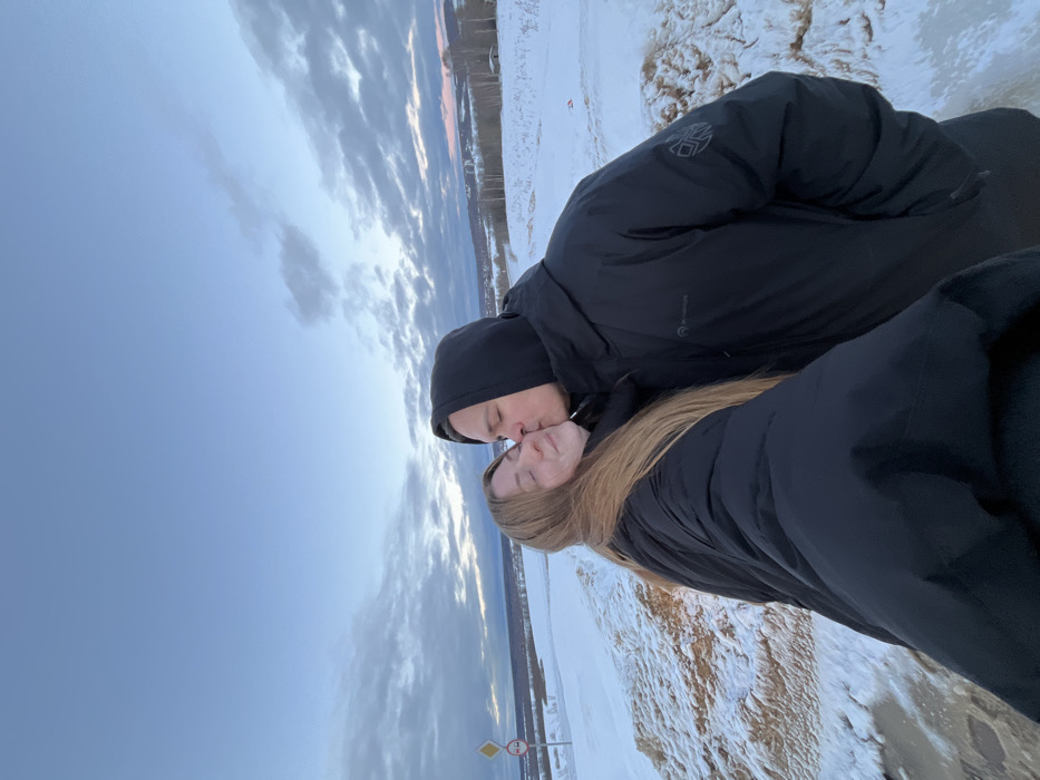 The image portrays two individuals, a male and a female, in a snowy outdoor setting consistent with a winter landscape in Zubovo, Russia. The female, on the left, has long, light brown hair and wears a black puffer coat. Her eyes are closed, and she is smiling as the male, positioned on her right, kisses her on the cheek. The male wears a black hooded winter jacket with the hood up; a white logo (possibly "Venture") is visible on the chest, and a distinctive geometric emblem is on the left sleeve. The female's right arm is extended, indicating she is holding the camera for a selfie. The foreground consists of snow-covered ground, featuring a prominent mound of brown earth or sand partially covered by snow on the lower left. In the background, an expansive, snow-blanketed terrain with rolling hills and sparse trees extends to the horizon. Distant structures are faintly visible. A partially obscured road sign is present in the upper left background, appearing as a white circle with a red border and a horizontal black bar, positioned above a yellow rectangular sign. The sky is largely overcast with stratified clouds, displaying shades of blue with faint pink and orange tones near the horizon, suggesting late afternoon or early evening light.