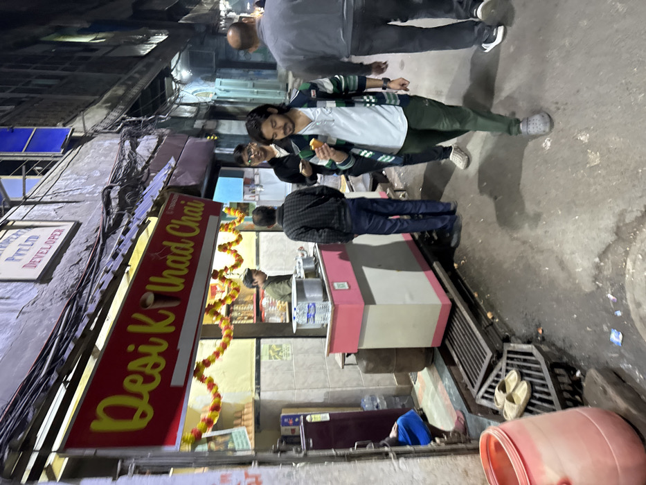 The image depicts a nighttime street scene in Kolkata, India. The central focus is a brightly lit, open-fronted street food stall named "Desi Ki [stylized tea cup icon] had Chai," indicated by a red sign with prominent yellow lettering and adorned with garlands of yellow and red flowers. The stall features a pink and off-white counter where cooking equipment, bottled water bottles, and a large metal gas cylinder are positioned. A male staff member in a green shirt stands behind the counter, facing right, engaged in preparation. To the far left of the stall, another individual is seated on a low stool near a red refrigerator. The ground surface is concrete pavement with visible metal drainage grates. A pair of light-colored sandals rests on one grate in the foreground. A large, red plastic barrel is present on the immediate left. Several individuals are visible: In the foreground, a man with dark hair, wearing a light grey shirt and a striped green, white, and blue jacket, walks towards the viewer while holding a piece of food in his right hand. Directly behind him, another man in a dark shirt and glasses looks down at a mobile phone. Further into the scene, a man in a dark plaid shirt stands with his back to the camera, facing the tea stall counter. On the far right, a man in a grey sweatshirt walks away from the viewer. Overhead, a dense cluster of electrical wires crisscrosses against the backdrop of dark, multi-story buildings that line the street. A sign reading "PROPERTY PVT LTD DEVELOPER" is mounted on a building facade above the tea stall. One upper-story window in a distant building appears to have blue-tinted glass. Scattered pieces of litter are visible on the pavement. The scene is primarily illuminated by artificial light sources originating from the tea stall and potentially overhead streetlights.