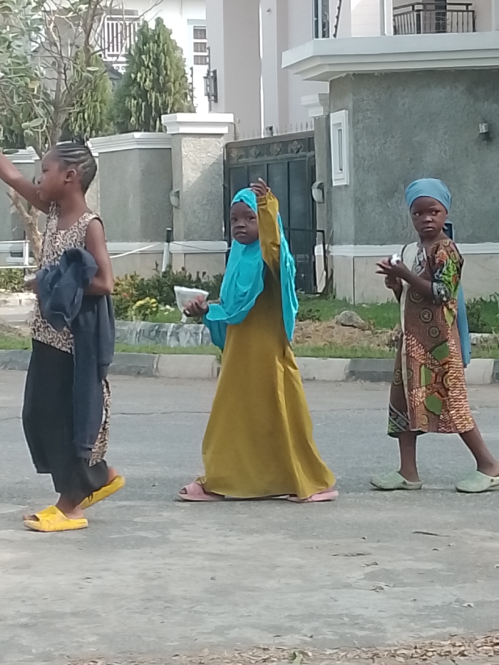 Three young females, identified as children, walk from left to right on a paved street in Gwarinpa, Nigeria