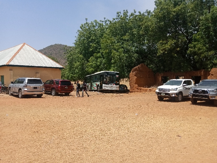 scene in Zum, Nigeria, located at coordinates 10.116 latitude and 13.046 longitude. Four vehicles are parked on a dirt lot in front of a building with a corrugated metal roof. The building has a yellow stucco exterior. There is a large tree in the foreground, partially obscuring the view of the lot. A large, white bus is parked in the middle of the lot, with its front facing the camera. A red SUV is parked to the left of the bus and a silver pickup truck is parked on the right of the bus. Behind the bus, there are two people in the distance, walking away from the camera, and another person is walking toward the camera. There are also remnants of a brick building in the background, to the right of the vehicles. The ground is dry and dusty. The sky is blue and clear.
