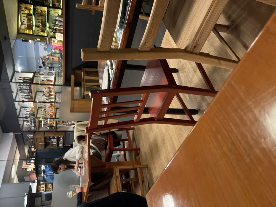 An indoor shot captures a restaurant or bar interior, focusing on wooden furniture. Two wooden tables, one partially obscured by the other, dominate the foreground. The central focus is a red wooden chair with a slated back. In the background, a woman in a white top is seated at a table, near what appears to be a partially visible man in a dark jacket. Shelves filled with bottles, possibly alcohol, line the wall, suggesting the venue is a bar or restaurant. The scene is well-lit with artificial lighting.