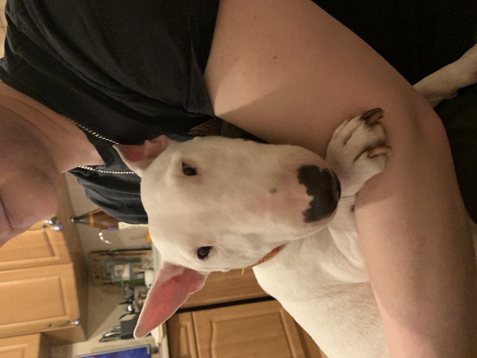 - "The scene depicts a white Bull Terrier dog being held by a person in an indoor kitchen environment in Chaikovsky, Russia" by FM-RWjjF2, licensed under CC BY 4.0