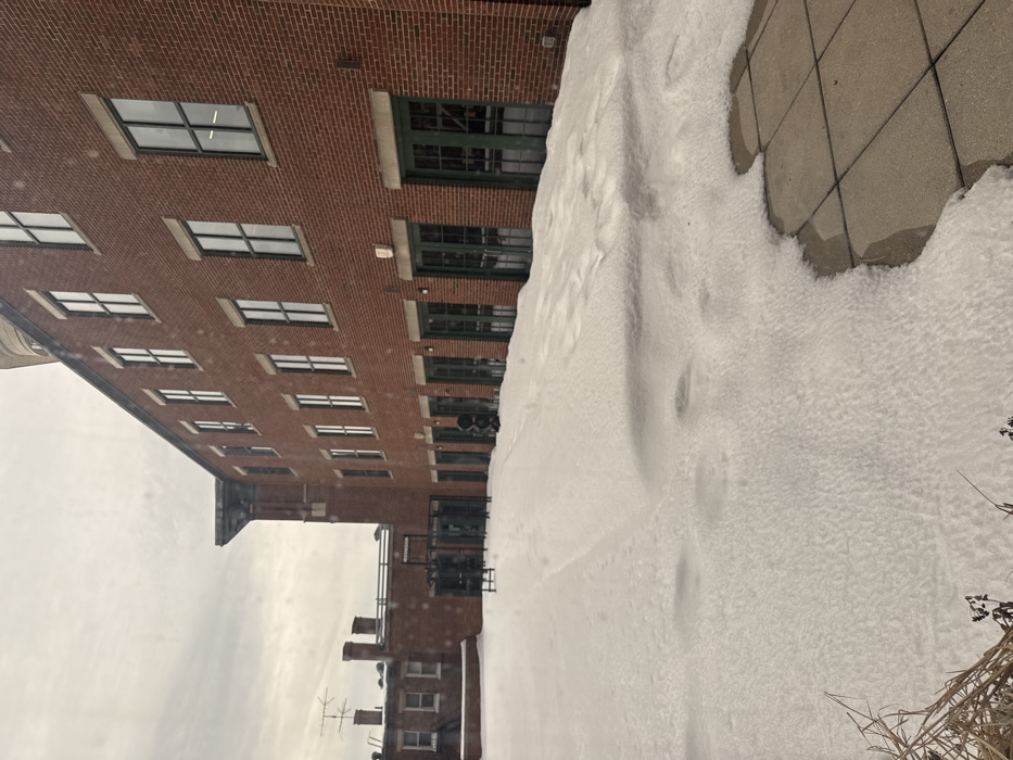 A brick building with dark-framed windows stands beside a snowy ground. Part of the ground is paved with square tiles, while most is covered in deep snow. The building's multiple stories are lined with uniformly spaced windows. In the foreground, dry, withered plants rise above the snow. The scene is viewed from an elevated position, with a cloudy sky reflecting on the left of the image.