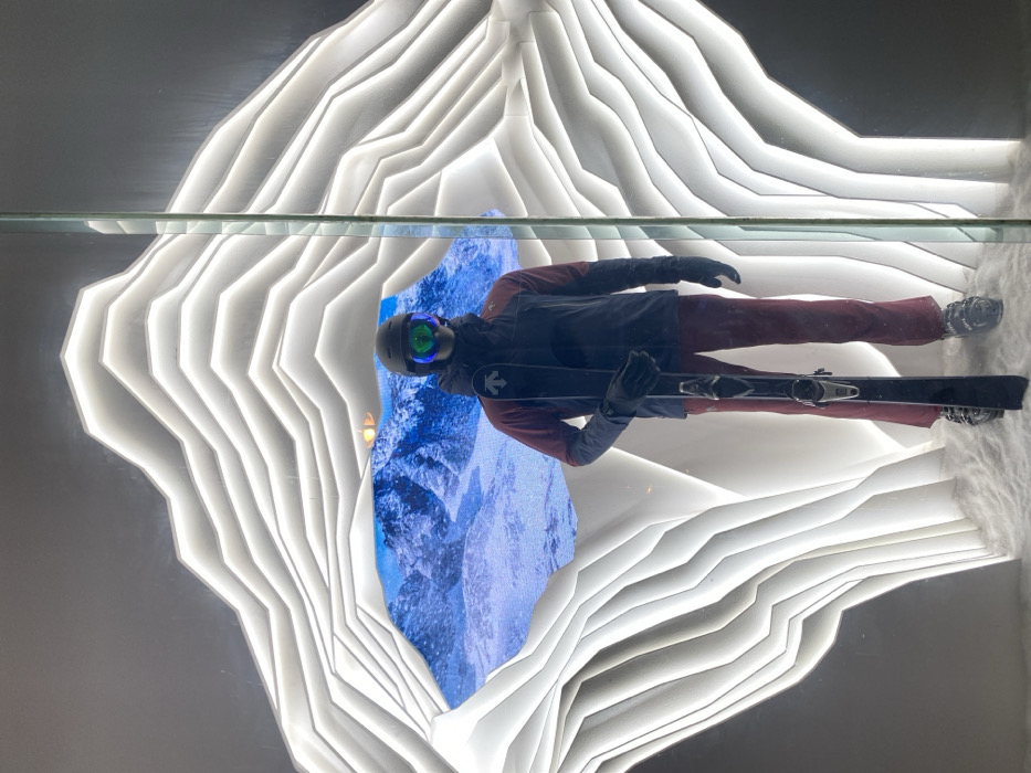 The image depicts a retail window display in the city of Linghe, China. A single mannequin, presented as a skier, stands centrally in the foreground. The mannequin wears a black ski helmet, green and blue reflective ski goggles, a blue and maroon ski jacket with a white "Descente" logo on the left chest, maroon ski pants, black gloves, and black ski boots. It holds a single black ski vertically in its gloved left hand. The mannequin stands on a base covered with artificial white snow. The background is a dynamic, layered structure of illuminated white panels, curving upwards and outwards, forming a stylized representation of icy peaks or an abstract mountain range. Embedded within this structure, directly behind the mannequin, is a rectangular digital screen displaying a vivid image of a snow-covered mountain landscape under a clear sky. The entire display is enclosed behind a clear glass panel, visible as a vertical seam and subtle reflections on the right side of the frame.
