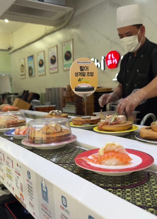 conveyor belt sushi restaurant. Sushi pieces are arranged on plates which are circulating on the conveyor belt. A chef in a white hat and a mask is preparing sushi at the counter in the background. The restaurant has a sign in Korean and English reading "sushi maju". There are price lists and promotional materials attached to the side of the conveyor belt system. The plates of sushi include salmon nigiri, shrimp nigiri, and other varieties. The restaurant's interior features decorative artwork and a modern design.