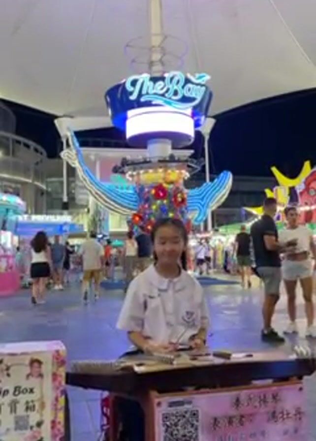 A young Asian girl in a school uniform is playing a Thai hammered dulcimer in a crowded public square at night. Behind her is a large, lit-up sign that reads "The Bay." People are walking around in the background. A sign in front of her reads "Thai Hammered Dulcimer by Fong Mudan." A tip box is on the left.