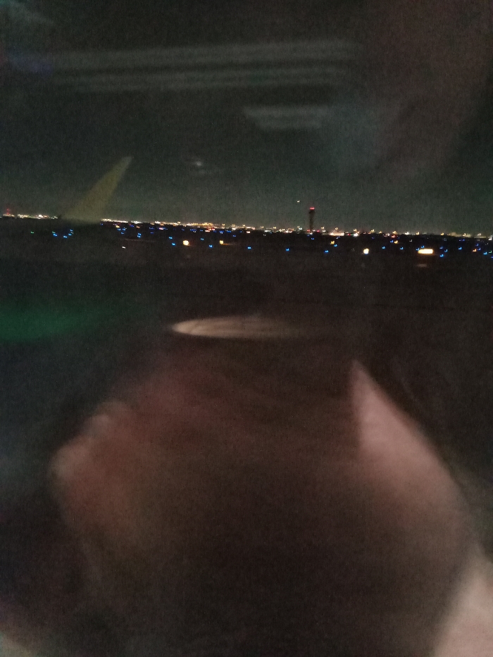 An airplane wing is visible on the left. Beyond it are lights resembling a city skyline. A slender tower rises from the cityscape. Foreground focus is on a blurry human face reflected in the plane window. The image is taken at night, with overall dim lighting.