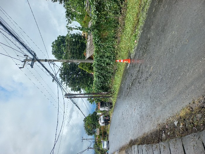 A narrow paved road curves with a strip of grass to the right. A small traffic cone sits at the edge of the road. Lush greenery and foliage line the background. Utility poles with an array of wires stretch overhead, converging towards the distance. Several vehicles are seen further down the road. The sky is overcast with scattered clouds.