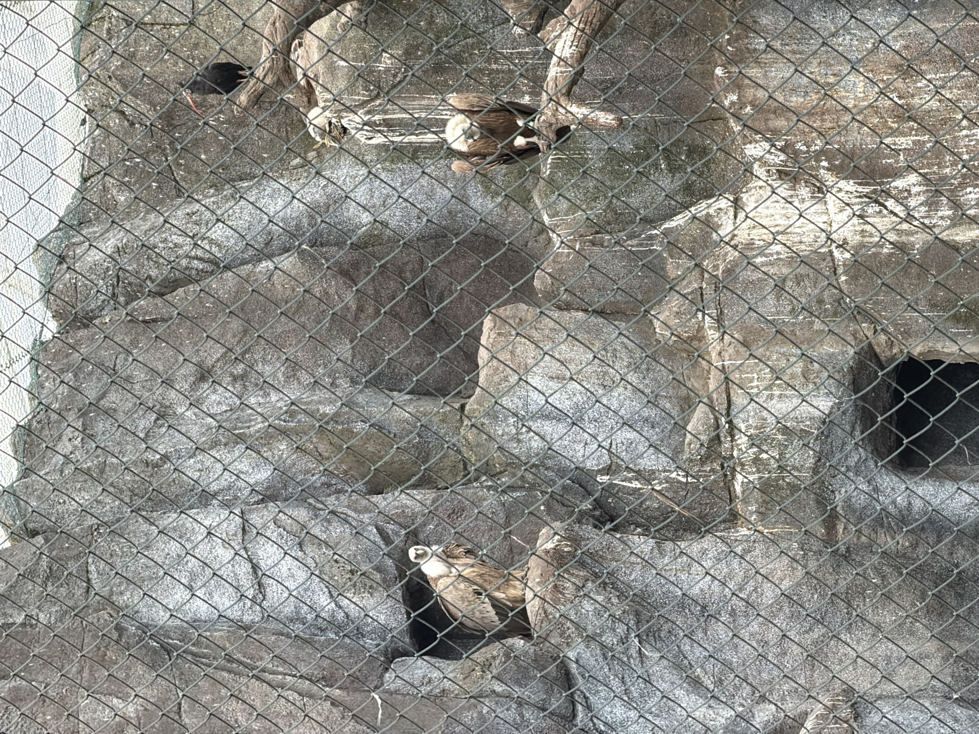 bird exhibit at the Leipzig Zoo in Leipzig, Germany, seen through a chain-link fence. In the upper left of the image, a black bird with red legs is perched on a branch. In the center, a brown and white bird is nestled against a rock face. In the lower portion of the image, another brown and white bird is visible, partially obscured by the rock. The background consists of an artificial rock formation, possibly part of the exhibit's enclosure. A dark, square-shaped opening is visible on the right side of the rock formation.