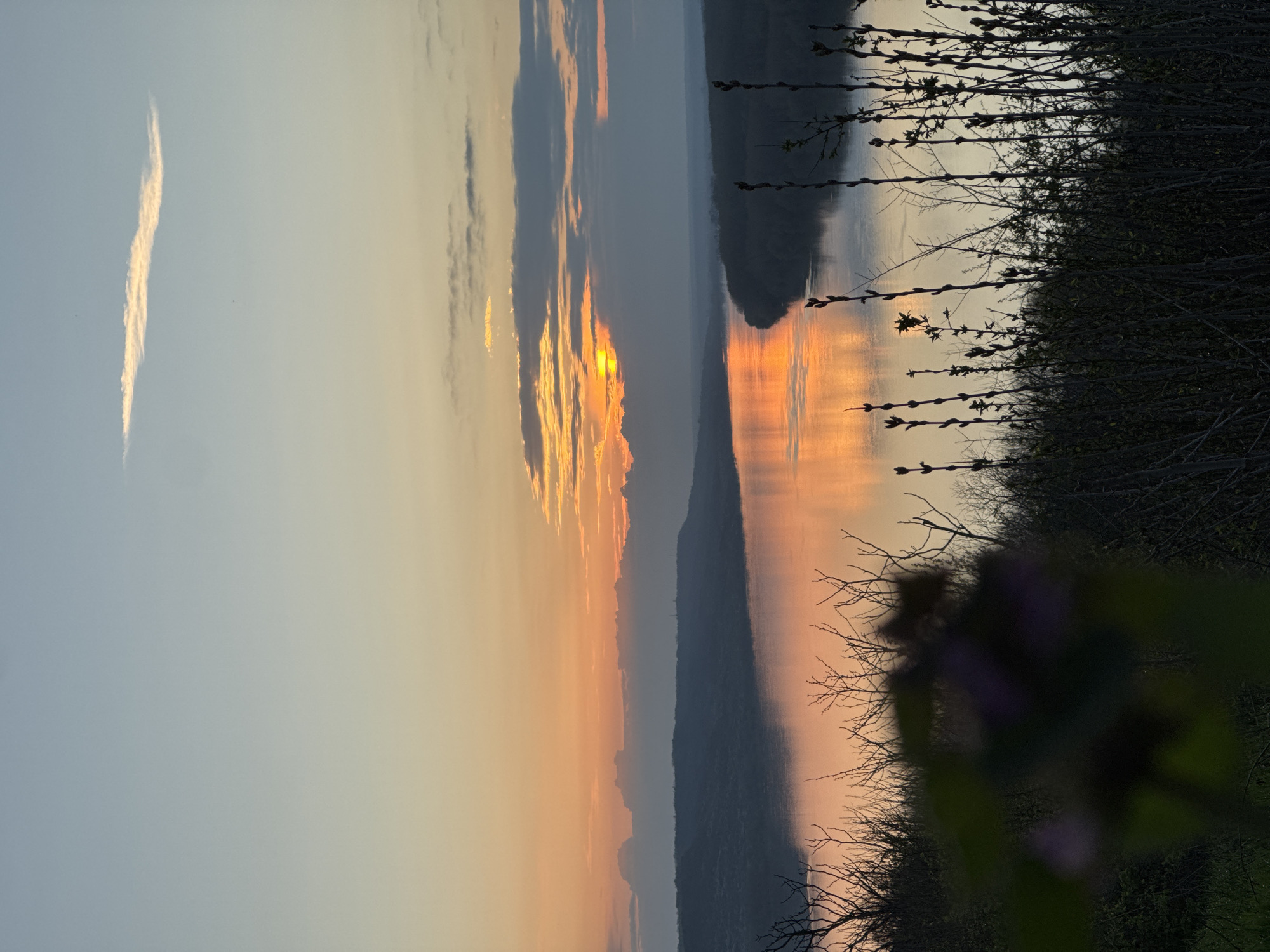 The image depicts a sunset over the Danube River, near the city of Kozloduy, Bulgaria. The sun is partially obscured by clouds, casting an orange reflection on the water. Silhouetted trees and bushes line the right side of the frame, and a blurry plant with purple flowers is visible in the bottom right corner. A thin, elongated cloud is positioned on the left side of the frame. A dark land mass appears on the opposite side of the river. The sky transitions from a light blue to an orange hue towards the horizon.