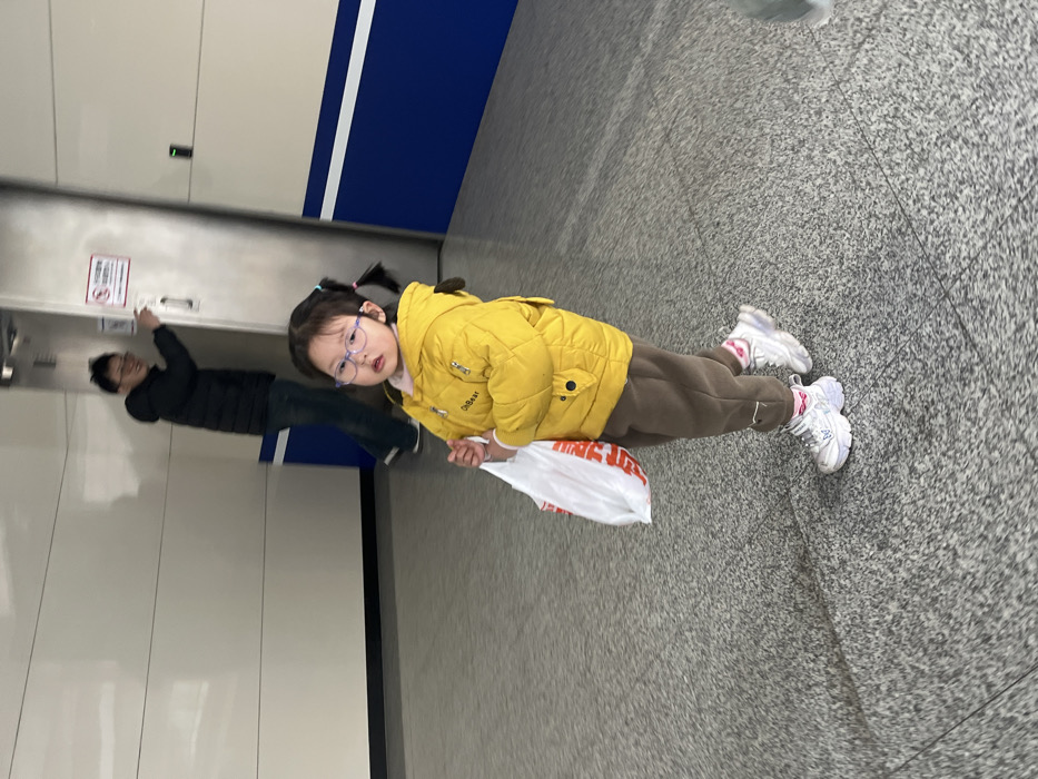 A young girl with pigtails, wearing glasses, a yellow jacket, brown pants, and white sneakers, stands on a gray tiled floor holding a white plastic bag. Behind her, a man presses a button on an elevator panel against a white wall with a blue stripe. The scene appears to be inside a subway station or similar public transportation area.