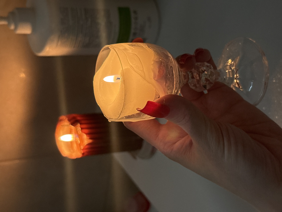 **Location:** Перовское сельское поселение, Ukraine. **Scene:** An indoor, low-light environment, likely a bathroom, illuminated by two burning candles. In the foreground, a pale-skinned human hand, featuring red manicured fingernails, is holding a clear glass goblet. The goblet contains a melting, light-colored wax candle with a visible, active flame. In the blurred background, to the left, a second, taller cylindrical candle with a reddish-orange melting top and a lit wick is visible. To the right, a white pump-dispenser bottle, consistent with a personal care product, is partially visible and out of focus. All objects rest on a light-colored, flat surface. The primary light source is the warm glow emitted by the candle flames. No other individuals are present.