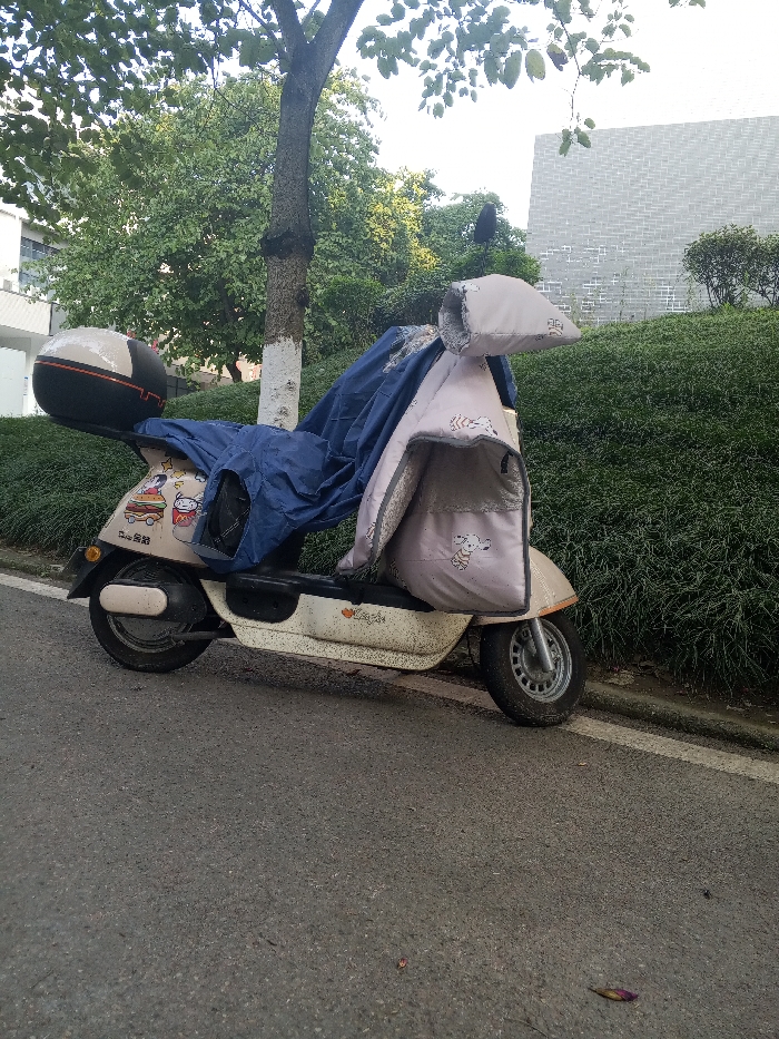 An off-white electric scooter, identified by "Gu Dong Chu Xing" branding and cartoon decals on its rear body, is parked on the asphalt roadside in Jiangjin, China. The scooter is equipped with a black rear storage box accented with an orange stripe and is partially covered by a dark blue tarp over its midsection. The front handlebars and rider's leg area are protected by a light grey quilted cover featuring cartoon animal patterns, specifically resembling sheep or dogs. The scooter is positioned adjacent to a dense hedge of green shrubs, alongside a dark grey asphalt road marked with a white painted edge line. In the background, a tree with a trunk partially painted white stands among green foliage, with a light-colored building visible to the left and a grey brick wall to the right. No individuals are present in the scene.