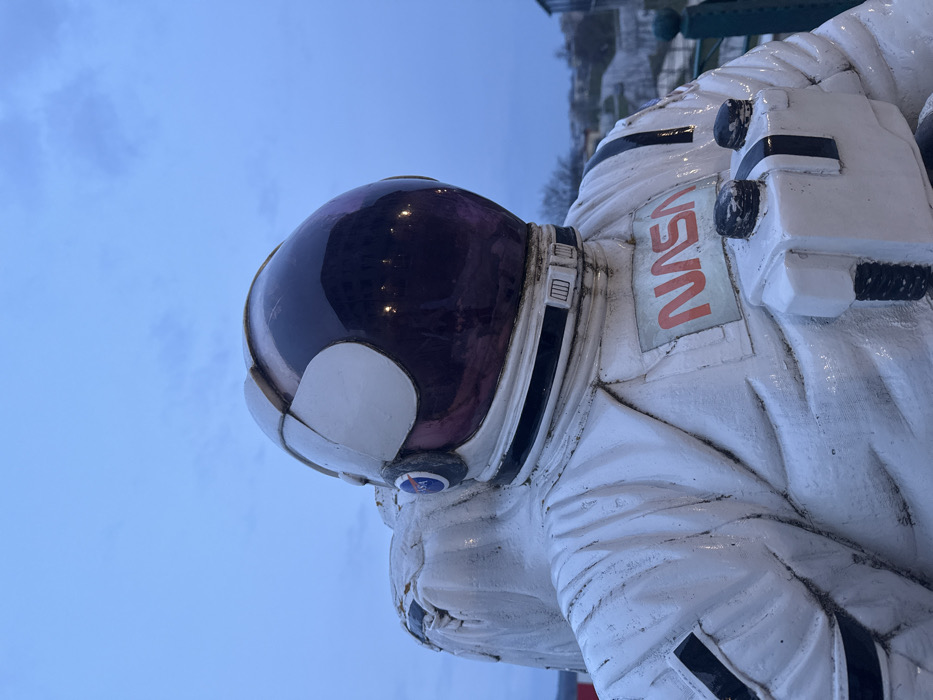 An outdoor image captures a weathered, white astronaut statue from the chest up, set against a blue-grey twilight sky