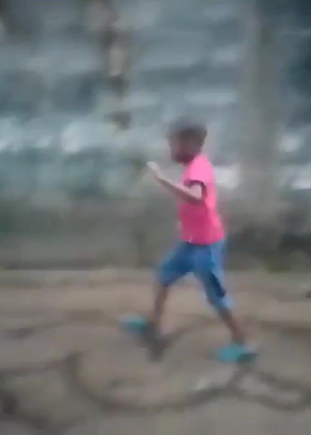 two children in a courtyard. The first child is wearing a bright green shirt, patterned leggings, and blue sandals. The second child is wearing a white shirt and shorts. The children are standing on sand with a large image drawn into it. The first child has small skateboards attached to their feet and is attempting to glide across the surface. The second child is near a large red gate and appears to be cleaning or sweeping with a long stick. A blue bucket sits to the right of the gate. The courtyard is surrounded by brick walls. The video quality is shaky and slightly blurred.
